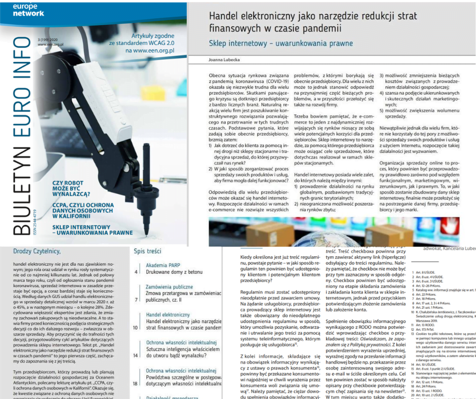 W nowym Biuletynie Euro Info, Enterprise Europe Network przy PARP ukazała się właśnie pierwsza z serii trzech, moich publikacji dotyczących e-commerce i regulaminu sklepu internetowego.