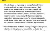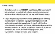 A w drugiej treściowo, e-book nie jest dla osób, których ambicją jest przede wszystkim zbudowanie swojej kancelarii szybko i zaraz. Treści w nim zawarte mogą nie ucieszyć osób, szukających formuły na spektakularne efekty, które następują natychmiast, a najpóźniej tydzień po podjęciu określonego działania. Nie ma tu magicznych formuł na pozbawione wysiłku realizowanie celów, ale są informacje o tym, jak nie robić rzeczy w sposób, który do niczego nie prowadzi, a Ty poświęcasz czas. Jest w nim sporo o planowaniu i organizacji, ale takich realnych, a nie z kosmosu.