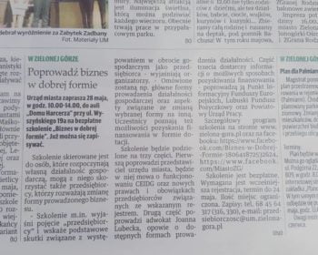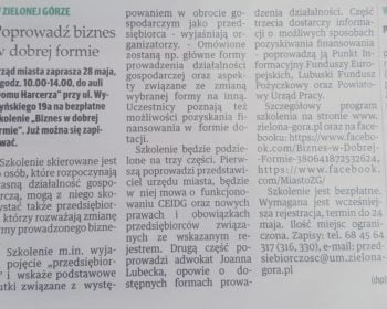Informacja o szkoleniu ,,Biznes w dobrej formie”, które odbędzie się w dniu 28 maja 2019 roku ukazała się w ,,Łączniku zielonogórskim”. Przypominam, że udział w szkoleniu wymaga wcześniejszej rejestracji. Termin zgłoszeń upływa w dniu 24.05.2019 r. Ilość miejsc jest ograniczona.